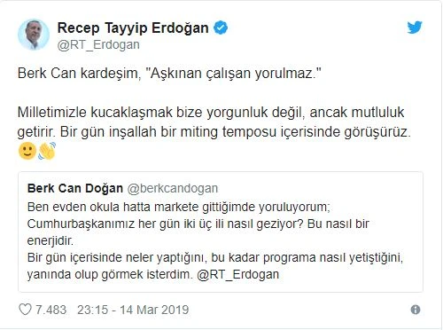 Türkiye Cumhurbaşkanı Recep Tayyip Erdoğan, Berk Can Doğan isimli kullanıcının yönelttiği, "Cumhurbaşkanımız her gün 2-3 ili nasıl geziyor? Bu nasıl bir enerjidir?" sorusunu Twitter hesabından "Berk Can kardeşim, 'Aşkınan çalışan yorulmaz.'" şeklinde yanıtladı.