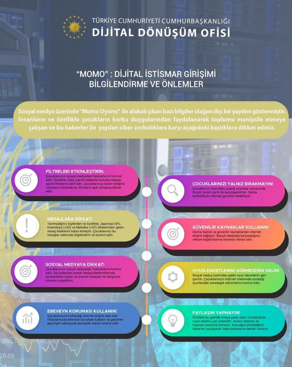 Çocuklar için son dönemin dijital ortamdaki en büyük tehlikelerinden biri olan 'Momo' oyunu için, Cumhurbaşkanlığı Dijital Dönüşüm Ofisi 8 maddelik önlem açıkladı.