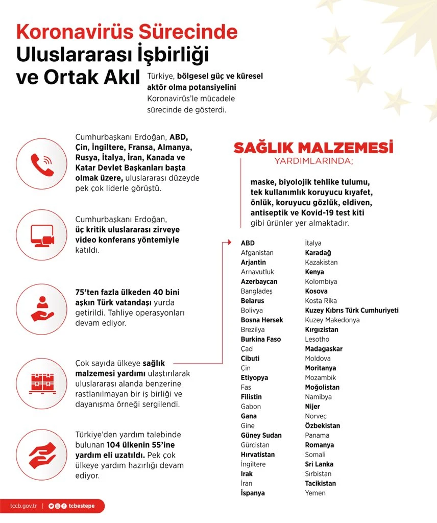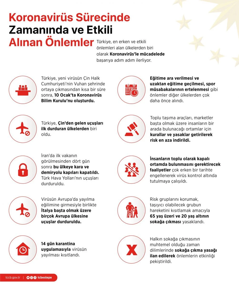Türkiye'nin en erken ve en etkili önlemleri alan ülkelerden biri olarak koronavirüsle mücadelede başarıya adım adım ilerlediği ifade edilen mesajda, şu bilgiler yer aldı: