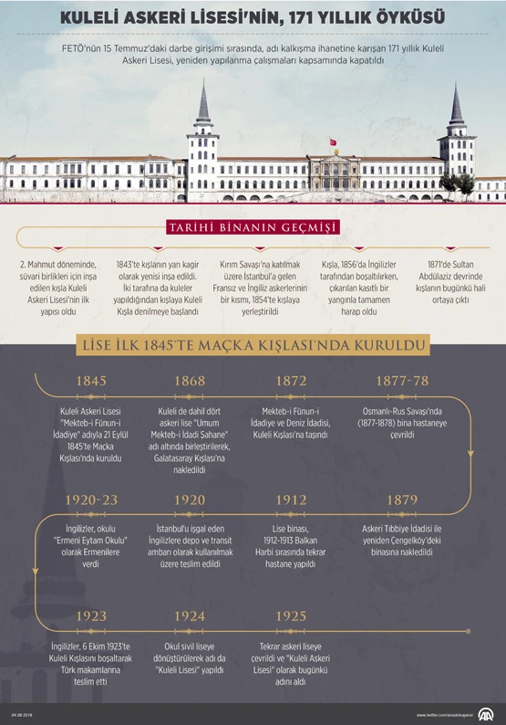 Fetullahçı Terör Örgütü'nün (FETÖ) 15 Temmuz'daki darbe girişimi sırasında, adı kalkışma ihanetine karışan 171 yıllık Kuleli Askeri Lisesi, yeniden yapılanma çalışmaları kapsamında kapatıldı.