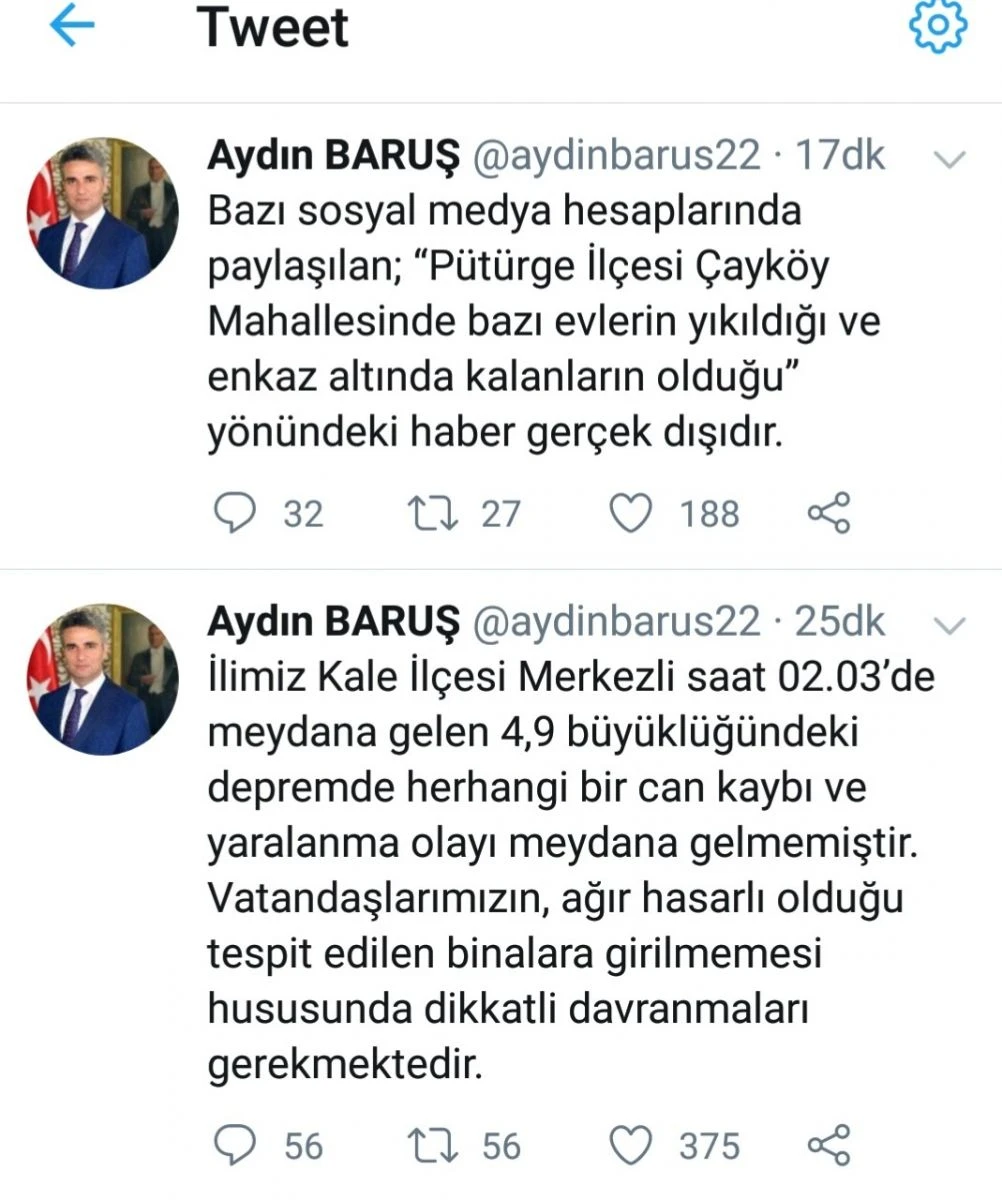 Vali Baruş, ayrıca bazı sosyal medya hesaplarında paylaşılan, Pütürge İlçesi Çayköy Mahallesinde bazı evlerin yıkıldığı ve enkaz altında kalanların olduğu yönündeki haberlerinde gerçek dışı olduğunu dile getirdi.