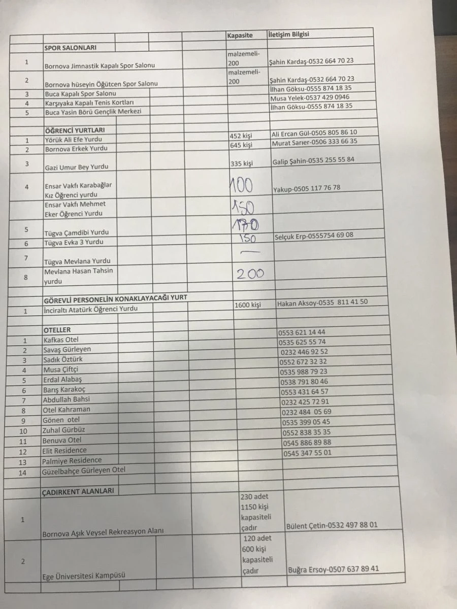 Bornova Aşık Veysel Rekreasyon Alanı ve Ege Üniversitesi Kampüsü'nde iki çadır kent kurulacağını belirten Vali Köşger'in paylaştığı listedeki spor tesisleri ve yurtlar şöyle: