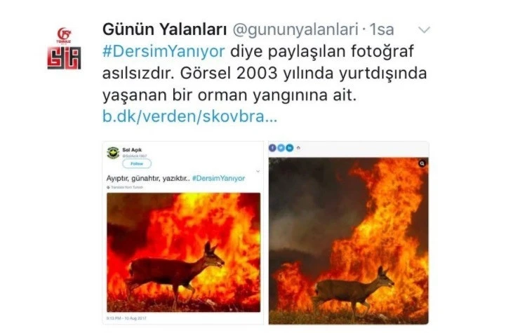 Tunceli Valiliğinden yapılan açıklamada, “Çeşitli sosyal medya ve basın yayın organlarında çıkan haberlerde ‘Dersim Yanıyor’ başlığı altında asılsız haberlerin yapıldığı ve ilimize ait olmayan yangın fotoğraflarının kullanıldığı görülmüştür. Çıkan haberler ve kullanılan fotoğraflarla ilgili hususların açıklanmasına ihtiyaç duyulmuştur” denildi.