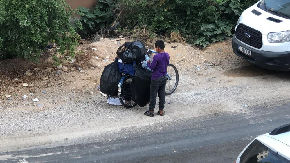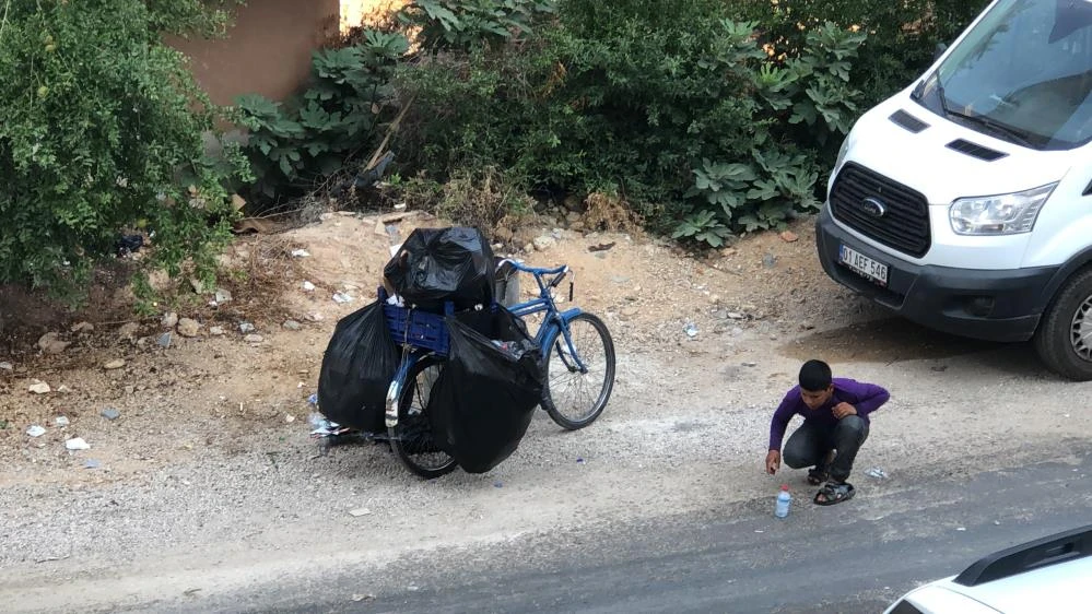 Oynadığı oyuna bir süre sonra son veren çocuk, bisiklet üzerindeki çöp poşetine pet şişeleri yerleştirerek bulunduğu yerden uzaklaştı..