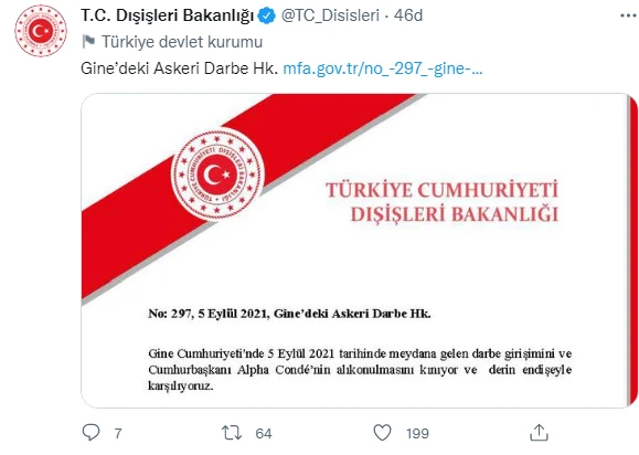 Dışişleri Bakanlığı tarafından yapılan açıklamada, “Gine Cumhuriyeti'nde 5 Eylül 2021 tarihinde meydana gelen darbe girişimini ve Cumhurbaşkanı Alpha Condé’nin alıkonulmasını kınıyor ve derin endişeyle karşılıyoruz" denildi.