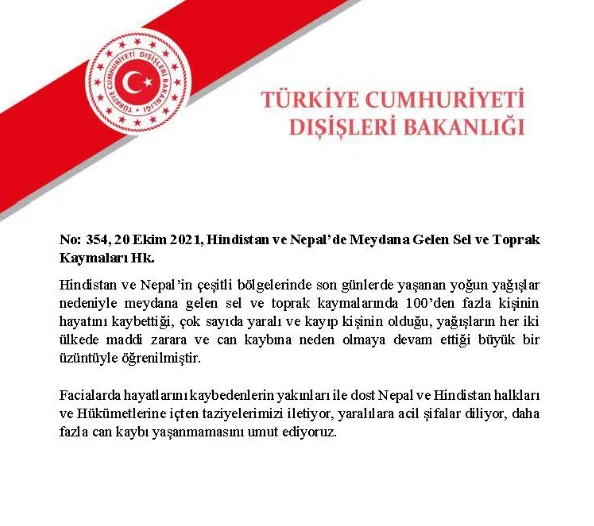 Dışişleri Bakanlığından yapılan yazılı açıklamada, “Hindistan ve Nepal’in çeşitli bölgelerinde son günlerde yaşanan yoğun yağışlar nedeniyle meydana gelen sel ve toprak kaymalarında 100’den fazla kişinin hayatını kaybettiği, çok sayıda yaralı ve kayıp kişinin olduğu, yağışların her iki ülkede maddi zarara ve can kaybına neden olmaya devam ettiği büyük bir üzüntüyle öğrenilmiştir"