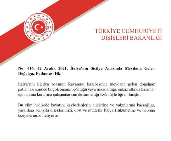 Dışişleri’nden yapılan açıklamada, “İtalya’nın Sicilya adasının Ravanusa kasabasında meydana gelen doğalgaz patlaması sonucu birçok binanın çöktüğü veya hasar aldığı, enkaz altında kalanlar için arama kurtarma çalışmalarının devam ettiği üzüntüyle öğrenilmiştir. Bu elim hadisede hayatını kaybedenlerin ailelerine ve yakınlarına başsağlığı, yaralılara acil şifa dileklerimizi, dost ve müttefik İtalya Hükümetine ve halkına taziyelerimizi iletiyoruz” denildi.
