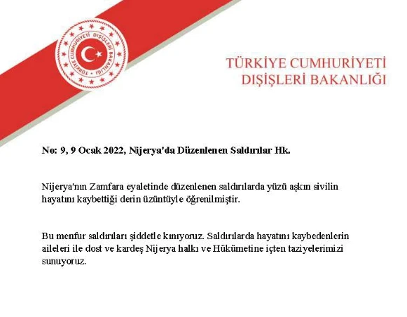 Dışişleri'nden yapılan açıklamada, "Nijerya'nın Zamfara eyaletinde düzenlenen saldırılarda yüzü aşkın sivilin hayatını kaybettiği derin üzüntüyle öğrenilmiştir. Bu menfur saldırıları şiddetle kınıyoruz. Saldırılarda hayatını kaybedenlerin aileleri ile dost ve kardeş Nijerya halkı ve Hükümetine içten taziyelerimizi sunuyoruz.” denildi.