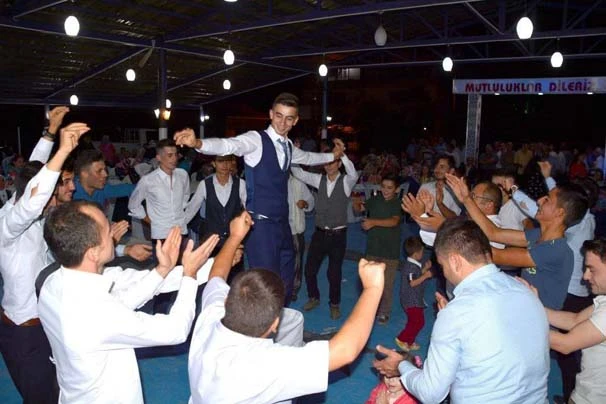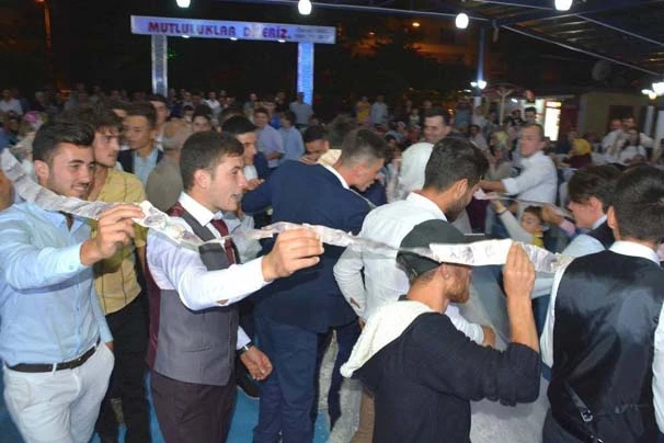 Kastamonu’nun İnebolu ilçesinde Yerneli Köyünde ikamet eden Şerife-Emrah Delen çiftinin düğünde ilginç bir takı olayı yaşandı. Çifttin arkadaşları tarafından toplu iğne yardımıyla birleştirilen paralar yaklaşık 40 metre uzunluğuna ulaştı. Düğünde takı merasimine geçildiği esnada çiftin arkadaşları, 40 metre uzunluğundaki para takısını çifte takmak istedi. Görenleri adeta şaşkına çeviren takıda gelin ve damat zor anlar yaşadı. Uzun kuyruk oluşturarak çifttin arkadaşları tarafından salona getirilen para takısı, gelin ile damada takılmak istendi. Fakat para takısının çok uzun olması nedeniyle paralar çiftin etrafında döndürüldü. Para takısının arasında kalan çift, şaşkınlıklarını gizleyemedi. Salonda büyük alkış alan bu ilginç görüntü sonrası damat ve gelin, paraların arasında kayboldu. Takı merasiminin ardından damada ayrıca ayvalardan oluşan takıda boynuna asıldı. Takı merasiminin ardından düğüne katılanlarla çiftin arkadaşları, çifte telli oynayarak bu mutlu günlerine kutladılar.