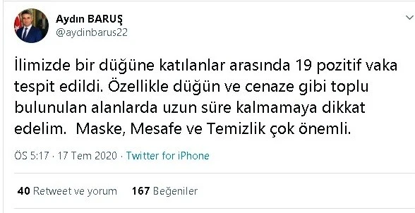 Yeni tip korona virüs (Covid-19) salgını ile mücadele sonrasında, maske ve sosyal mesafe kuralları çerçevesinde 1 Temmuz itibariyle açılan düğün salonlarında yetkililerin uyarıları dinlenmedi. Malatya’da da bir düğüne katılan davetlilerden 19’unda korona virüs tespit edilince, sosyal medya hesabından açıklama yapan Malatya Valisi Aydın Baruş, vatandaşları uyardı. Baruş, mesajında, “İlimizde bir düğüne katılanlar arasında 19 pozitif vaka tespit edildi. Özellikle düğün ve cenaze gibi toplu bulunulan alanlarda uzun süre kalmamaya dikkat edelim. Maske, mesafe ve temizlik çok önemli” diyerek kurallara rivayet edilmesini istedi.
