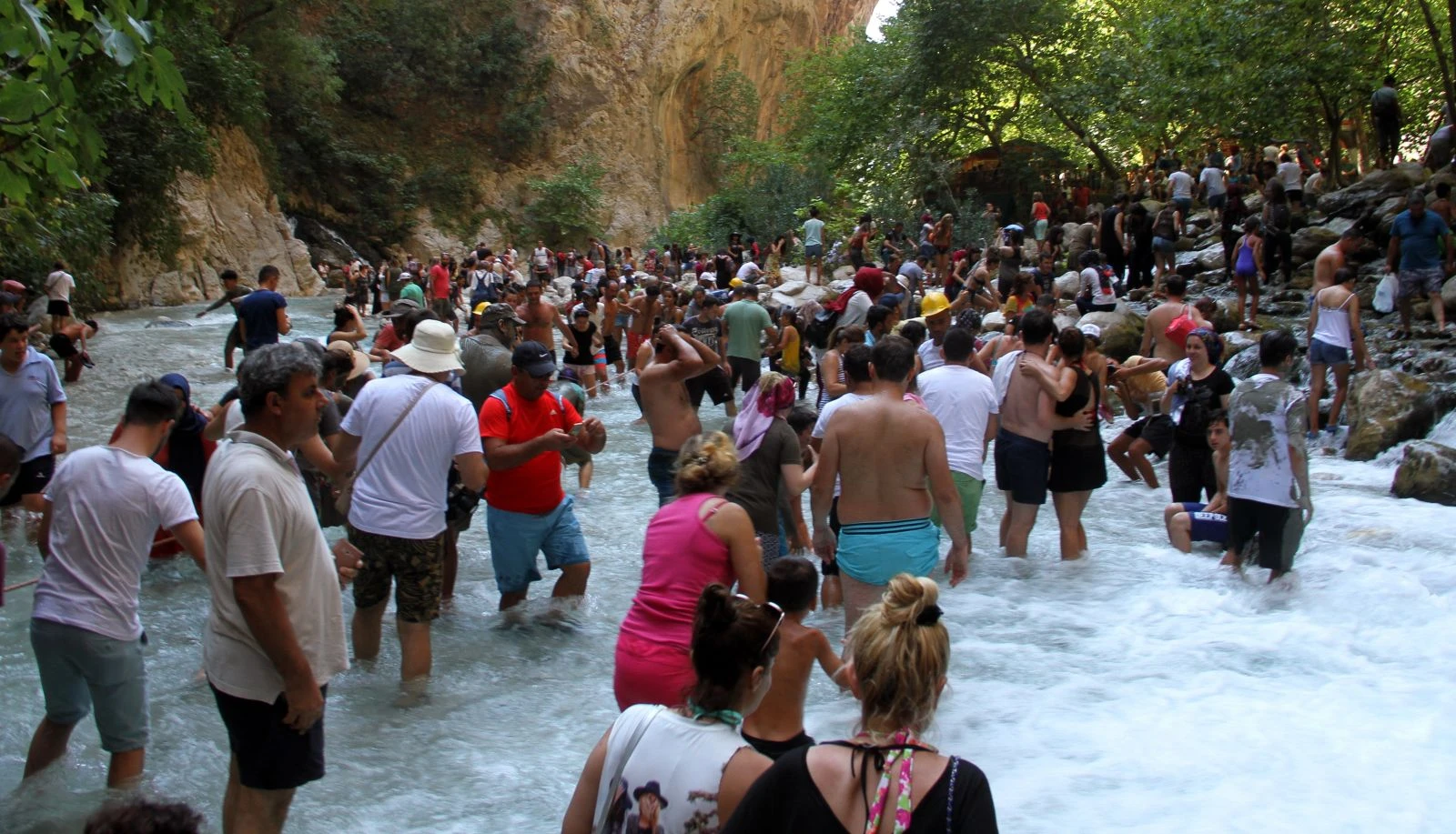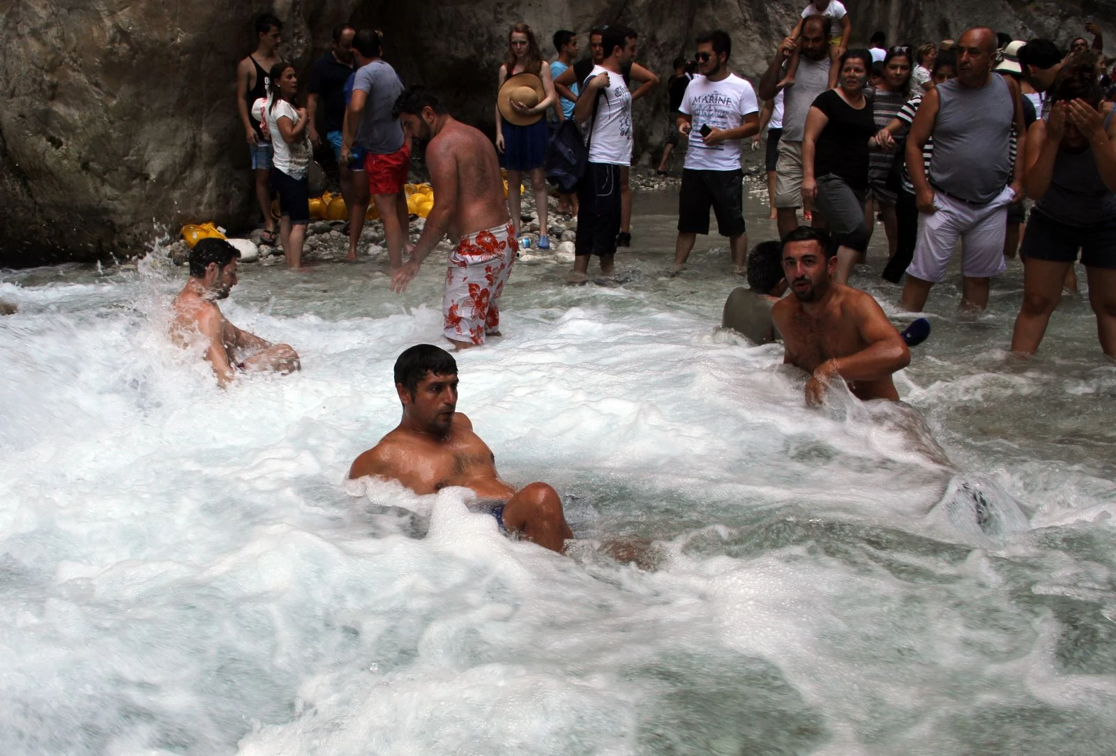 Bazı tatilciler serinlemek için sıfır dereceye yaklaşan suya girdi. Yoğunluğa rağmen sıcaktan kaçarak kanyona giren tatilciler, doğal klima etkisiyle keyifli anlar yaşadı. Yoğunluk nedeniyle Saklıkent yolunda uzun araç kuyruğu oluşurken, kanyon içinde adım atacak yer kalmadı.