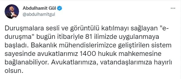 "Duruşmalara sesli ve görüntülü katılmayı sağlayan 'e-Duruşma' bugün itibariyle 81 ilimizde uygulanmaya başladı. Bakanlık mühendislerimizce geliştirilen sistem sayesinde avukatlarımız 1400 hukuk mahkemesine bağlanabiliyor. Avukatlarımıza, vatandaşlarımıza hayırlı olsun."