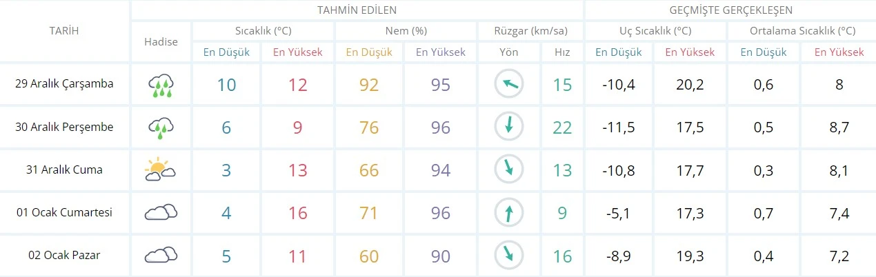 Edirne'de bugün başlayan şiddetli yağmurlar kenti olumsuz etkilerken yağışların yarın ve perşembe günü de aralıksız devam etmesi bekleniyor. Meteoroloji Genel Müdürlüğü'nün 5 günlük hava tahmin raporuna göre, kentte kaydedilmesi beklenen en yüksek sıcaklıklar şöyle: