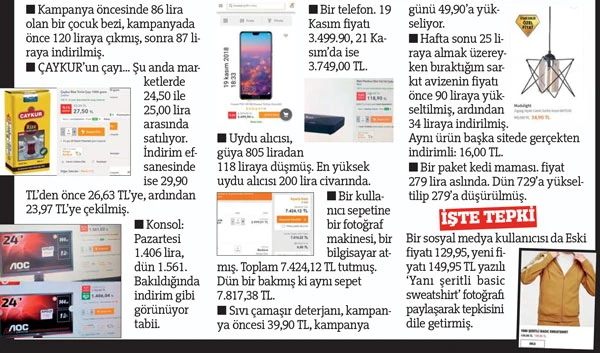 ‘Süper Cuma’ veya ‘Efsane Cuma’ diye lanse edilen indirim dönemi öncesinde 649 lira olan bir dış fırçalama makinesinin fiyatını 1.489,90 liraya çıkarıp, indirimin başladığı gece yeniden 649,90 liraya satıldığını görünce kendisini ‘aldatılmış’ hisseden bir okurumuzun yanı sıra, “Birkaç ay önce 300 liraya mont aldım. Bugün indirim var diye oğluma almak üzere sitesine girdiğim markanın fiyatını 1.300 liraya çıkarıp 900 liraya indirdiğini gördüm. Yani, indirimli hâli bile benim aldığım fiyatın 3 katı” diyerek isyan etti. Bir internet sitesinde daha önce ürünleri ‘sepete atarak’ bekleten bir tüketici de “Efsane cuma gelince sepetimdeki ürünler 400 lira arttı” dedi.
