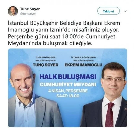 CHP'nin İzmir adayı Tunç Soyer, Twitter hesabından kutlamanın iptal edildiğini duyurdu. Soyer, "Yarın saat 18.00'da Sayın Ekrem İmamoğlu ile yapılması planlanan halk buluşmamız Sayın İmamoğlu'nun İstanbul'daki yoğun gündemi nedeniyle ertelenmiştir. Kutlama buluşmamızın tarihi kısa sürede yeniden paylaşılacak. Anlayışınız için çok teşekkür ederim" ifadelerini kullandı.