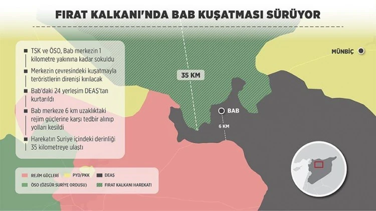Gelişmeler karşısında ÖSO, Bab merkeze 6,2 kilometre uzaklıkta olan rejim güçlerine karşı tedbir alarak, önceki gün Halep-Bab yolunu kesti.