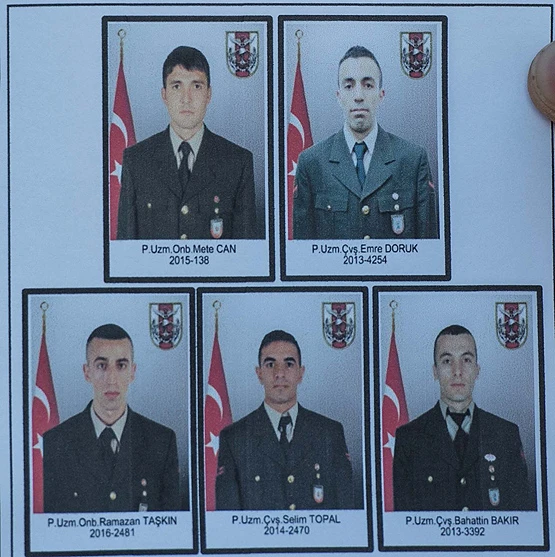 Şehit Piyade Uzman Çavuş Emre Doruk, Piyade Uzman Onbaşı Ramazan Taşkın, Piyade Uzman Çavuş Bahattin Bakır, Piyade Uzman Onbaşı Mete Can ve Piyade Uzman Çavuş Selim Topal'ın Türk bayraklarına sarılı naaşları, Gaziantep Adli Tıp Kurumundan askerler tarafından alındı.