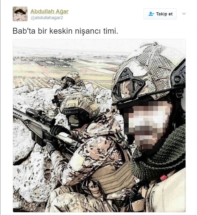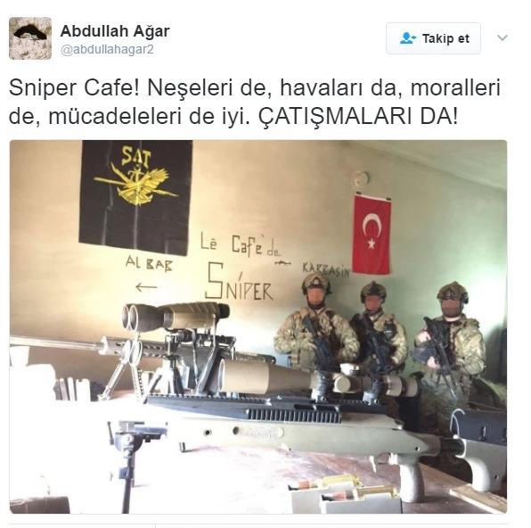 Terör ve güvenlik uzmanı Abdullah Ağar, El Bab'da görev icra eden SAT komandolarının neşelerinin yerinde ve morallerinin yüksek olduğunu yazarak fotoğraflar paylaştı. Bir karede sahada DEAŞ'lı teröristleri hedefe alan keskin nişancı timi görülüyor. Diğerinde de mevzi olarak kullanılan bir dairenin duvarında "Le Cade de Sniper" yazısı, SAT flaması ve Türk bayrağı görülüyor. Askerler silahlarıyla poz veriyor.