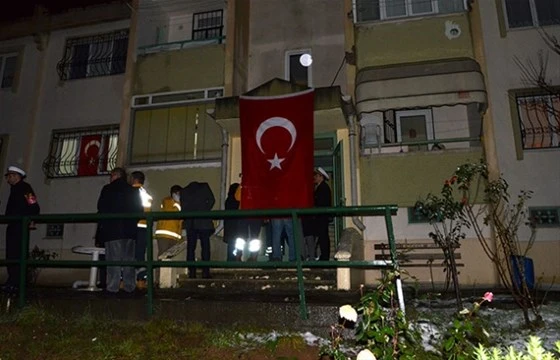 Şehidin evinin önüne belediye tarafından Türk bayrağı asıldı.