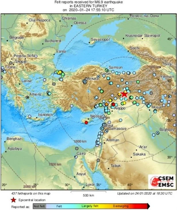 Avrupa Akdeniz Sismoloji Merkezi'nin açıklamasına göre, Elazığ'daki 6.5'lik depremin 120 milyon kişi tarafından hissedilmiş olabileceği tahmin ediliyor.