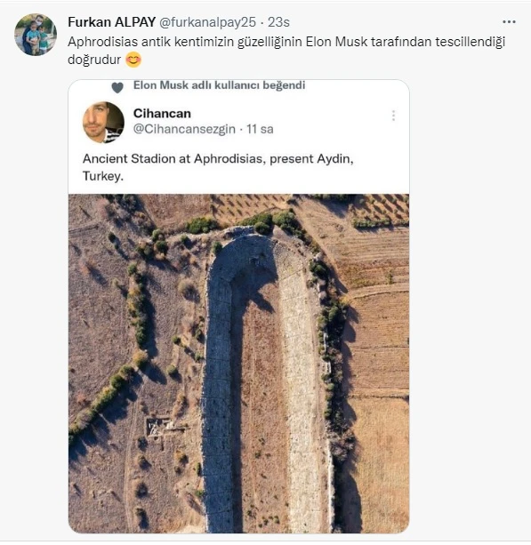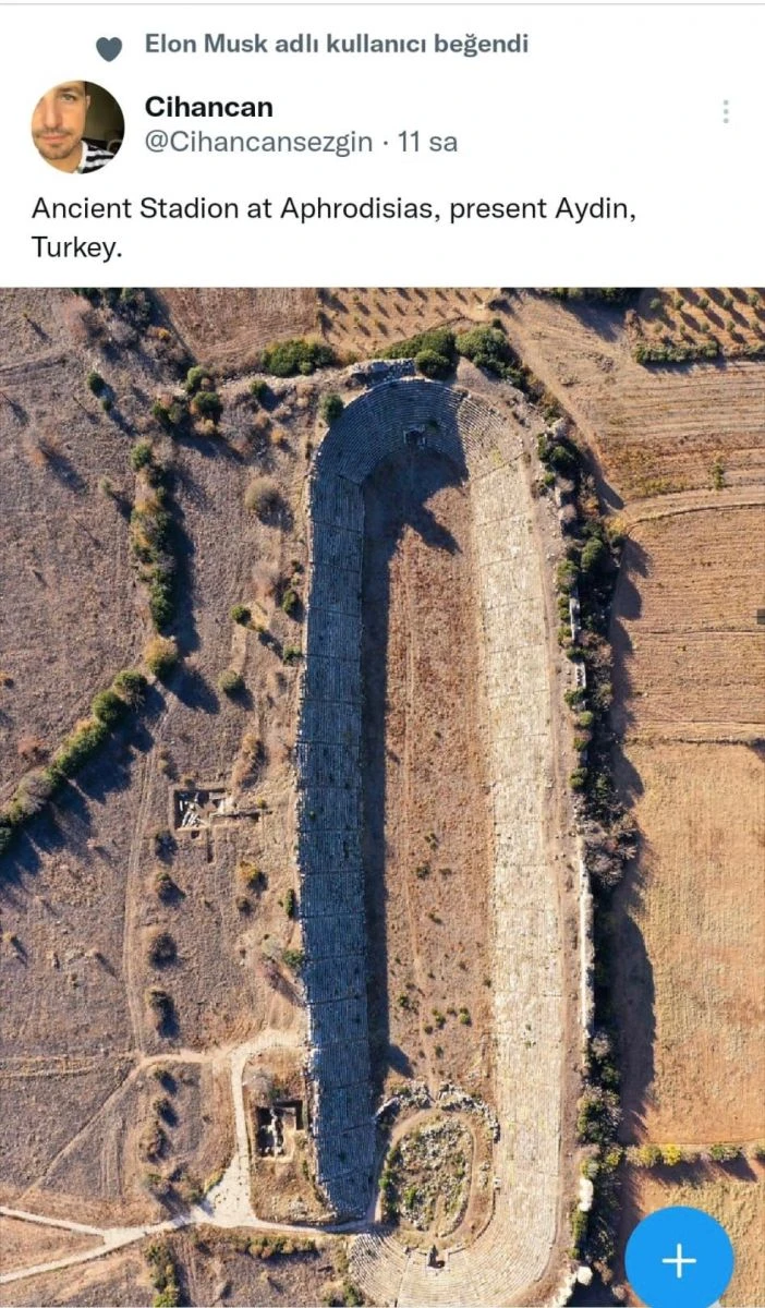 Elon Musk bir sosyal medya kullanıcısı tarafından paylaşılan Karacasu ilçesinde Karia Kenti olarak kurulan, antikçağın önde gelen mimarlık, sanat, heykeltıraşlık ve tapınma merkezlerinden olan Afrodisias Antik Kenti’ndeki stadyumu beğendi. Musk’ın beğenisi yöre halkında ve sosyal medyada heyecana neden oldu.