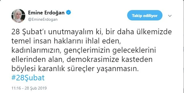 Cumhurbaşkanı Erdoğan'ın eşi Emine Erdoğan, 28 Şubat'ın yıl dönümü dolayısıyla sosyal medya hesabı Twitter üzerinden paylaşımda bulundu.