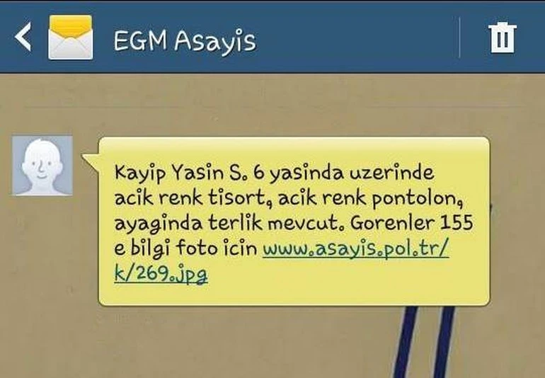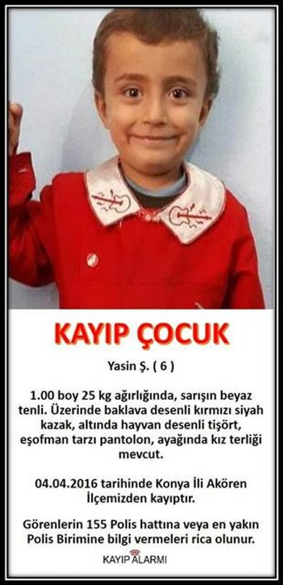 Akören İlçesi'nin eskiden köy olan Belkuyu mahallesinde oturan Anaokulu öğrencisi Yasin Şahin (6), geçen pazartesi günü okuldan geldikten sonra evlerinin önünde oynarken kayboldu. Yasin'in ailesi, mahallede yaptığı aramada çocuklarının izine rastlayamayınca jandarmaya haber verdi.Belkuyu mahallesinde jandarma ve AFAD ekipleri yaklaşık 10 kilometrelik alanda mağaraları, sarnıçları, kanyon, ağıllar olmak üzere her yeri didik didik aradı ve Yasin’n izine rastlayamadı. Bu doğrultuda vatandaşların cep telefonlarına EGM Asayiş ismiyle bilgilendirme mesajı atılmaya başlandı. Vatandaşlara gelen bilgilendirme mesajında, kayıp Yasin'in 6 yaşında üzerinde açık renk tişört, açık renk pantolon, ayağında terlik mevcut olduğu ve görenlerin 155'i aramaları istendi. Ayrıca, Yasin'in fotoğrafı ve bilgi için www.asayis.pol.tr/k/269.jpg adresini ziyaret etmeleri istendi.