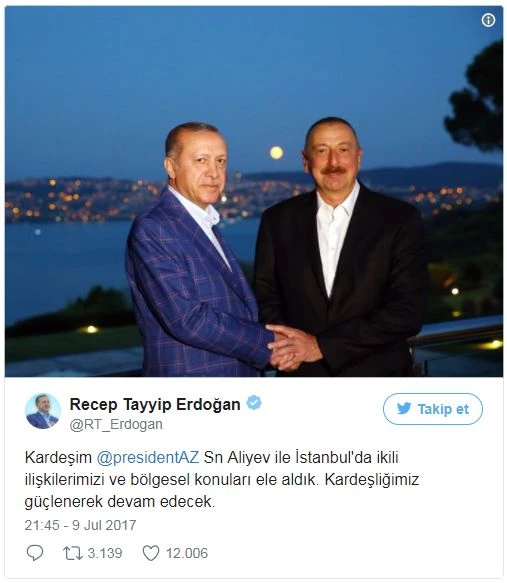 Bu arada, Cumhurbaşkanı Erdoğan, Azerbaycan Cumhurbaşkanı Aliyev ile boğaz manzarası eşliğinde çekilen fotoğrafını sosyal medya hesaplarından paylaştı.