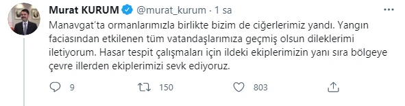 Bakan Kurum sosyal paylaşım sitesi Twitter hesabından yaptığı paylaşımda, “Manavgat’ta ormanlarımızla birlikte bizim de ciğerlerimiz yandı. Yangın faciasından etkilenen tüm vatandaşlarımıza geçmiş olsun dileklerimi iletiyorum. Hasar tespit çalışmaları için ildeki ekiplerimizin yanı sıra bölgeye çevre illerden ekiplerimizi sevk ediyoruz.