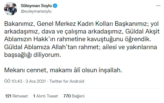 (Bakan Soylu'nun Güldal Akşit'in vefatını duyuruduğu o paylaşım)
