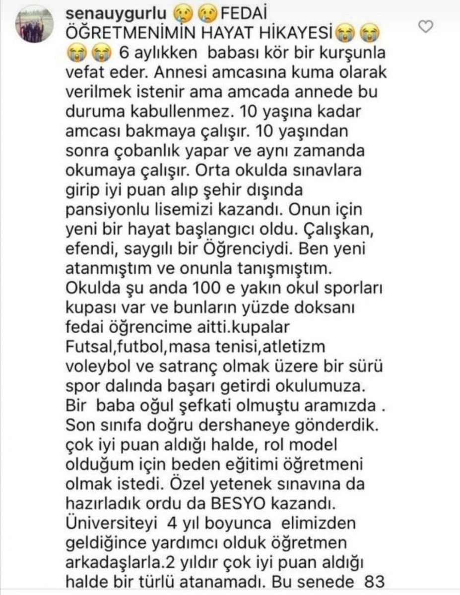 Futsal, futbol, masa tenizi, atletizm, voleybol ve satranç gibi birçok spor dalıyla ilgilenerek başarı kazanan Fedai ile arasında baba-oğlu ilişki olıştuğunu vurgulayarak son sınıfta dershaneye gönderdiklerini, kendisini rol model aldığı için beden eğitimi öğretmeni olmak istediğini ve BESYO okuyarak bu hayaline kavuştuğunu anlatan öğretmen, 2 yıldır çok iyi puan almasına rağmen atanamayan Fedai'nin bu yıl da 83 puan aldığını ancak buna rağmen atamadığını ifade etti.