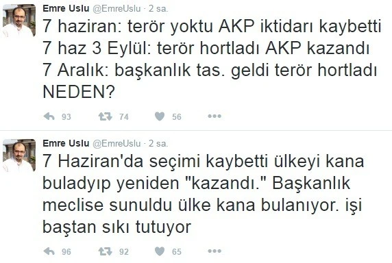 "7 haziran: terör yoktu AKP iktidarı kaybetti. 7 haz 3 Eylül: terör hortladı AKP kazandı. 7 Aralık: başkanlık tasarısı geldi terör hortladı neden? 7 Haziran'da seçimi kaybetti ülkeyi kana bulayıp yeniden 'kazandı.' Başkanlık Meclis'e sunuldu ülke kana bulanıyor. İşi baştan sıkı tutuyor."