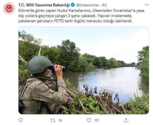 MSB yaptığı paylaşımda "Edirne'de görev yapan Hudut Kartallarımız, ülkemizden Yunanistan'a yasa dışı yollarla geçmeye çalışan 2 şahsı yakaladı. Yapılan incelemede, yakalanan şahısların FETÖ terör örgütü mensubu olduğu belirlendi" ifadelerine yer verildi.