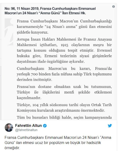 "Fransa Cumhurbaşkanı Emmanuel Macron’un 24 Nisan’ı “Anma Günü” ilan etmesi ucuz bir popülizm ve büyük bir hadsizlik örneğidir."