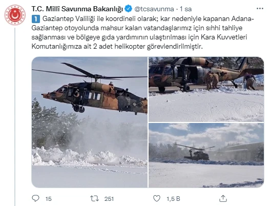 "Gaziantep Valiliği ile koordineli olarak; kar nedeniyle kapanan Adana-Gaziantep otoyolunda mahsur kalan vatandaşlarımız için sıhhi tahliye sağlanması ve bölgeye gıda yardımının ulaştırılması için Kara Kuvvetleri Komutanlığı'mıza ait 2 adet helikopter görevlendirilmiştir. Ayrıca yolda mahsur kalan TIR'ları kurtarmak için 2 adet çekici araç da görevlendirilmiş ve bölgede destek çalışmalarına başlamıştır. Türk Silahlı Kuvvetlerimiz ihtiyaç duyulması halinde tüm imkân ve kabiliyetleriyle göreve hazırdır" denildi.