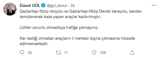 Gaziantep Valisi Davut Gül, Twitter'dan yaptığı açıklamada, vatandaşları zorunlu olmadıkça trafiğe çıkmamaları konusunda uyardı