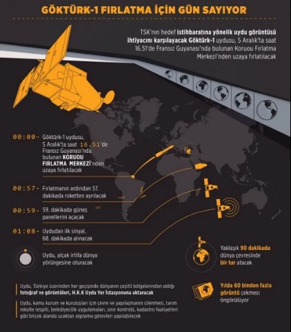 TÜRK Silahlı Kuvvetleri’nin (TSK) istihbarata yönelik görüntü ihtiyacını karşılayacak Göktürk-1 uydusu bugün saat 16.51’de Cumhurbaşkanı Tayyip Erdoğan’ın katılacağı törenle uzaya fırlatılacak.