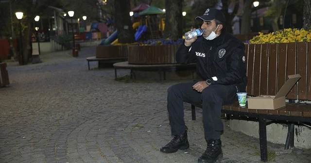 Tunalı Hilmi Caddesi girişinde sokağa çıkma kısıtlamasını denetleyen polis memurları, ilk iftarlarını kumanya ile yaptılar.