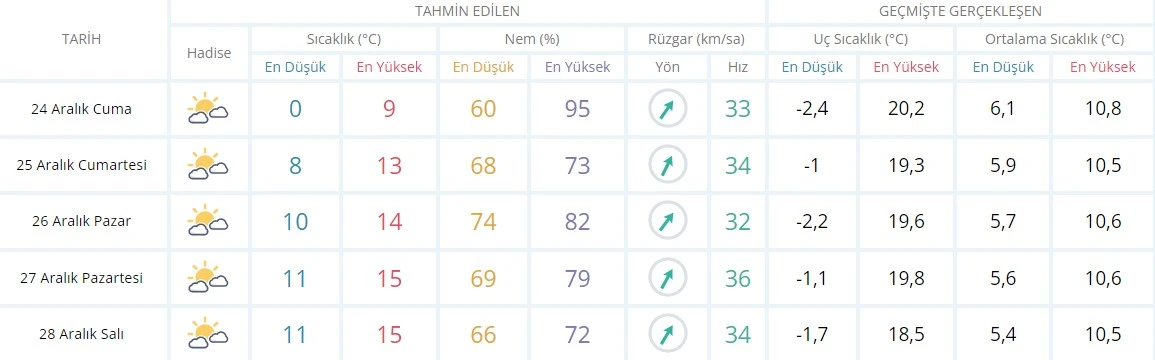Parçalı ve az bulutlu geçeceği tahmin ediliyor. Sabah ve gece saatlerinde iç kesimlerinde buzlanma ve don olayı ile birlikte yer yer sis ve pus hadisesi bekleniyor.