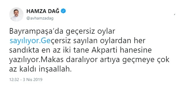Süreç devam ederken sayımları takip eden AK Parti Genel Başkan Yardımcısı Hamza Dağ, kişisel Twitter hesabından önemli bir bilgi paylaştı.