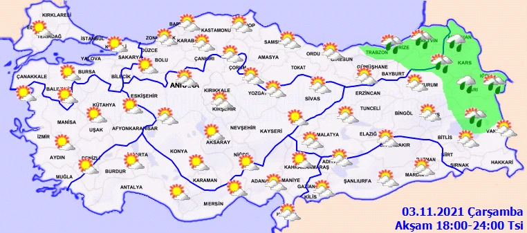 Marmara'nın doğusu, Doğu Akdeniz'in doğusu, İç Anadolu (Karaman hariç), Karadeniz, Doğu Anadolu(Malatya hariç), Güneydoğu Anadolu'nun doğusu ile Kütahya ve Muğla çevrelerinin yağışlı geçeceği tahmin ediliyor. Genellikle yağmur ve sağanak, Muğla çevreleri ile Doğu Karadeniz kıyılarında yer yer gök gürültülü sağanak şeklinde görülmesi bekleniyor. Sabah saatlerinde Marmara, İç Ege, Batı Karadeniz'in iç kesimleri ve İç Anadolu'da yer yer pus ve sis hadisesi bekleniyor.
