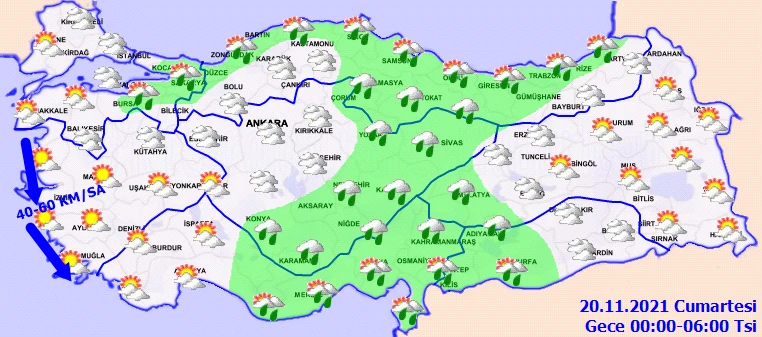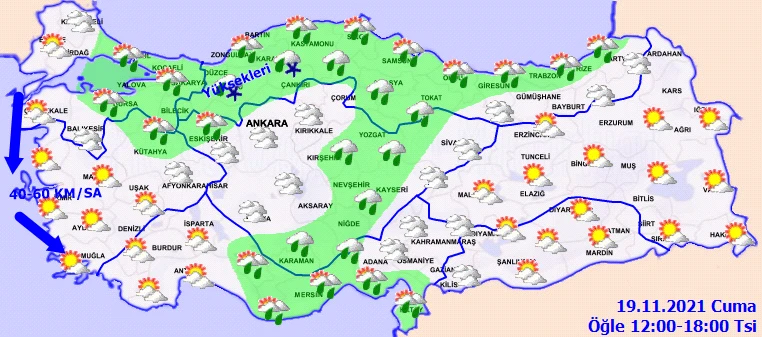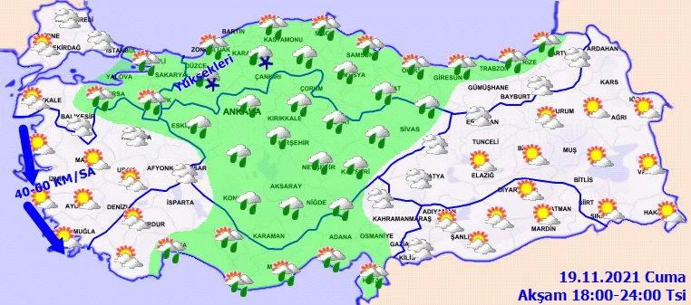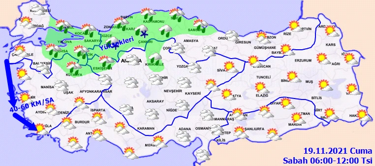 Meteoroloji Genel Müdürlüğü, 19 Kasım Cuma günü ülke genelinde parçalı ve yer yer çok bulutlu havanın hakim olacağını duyurdu. Marmara’nın doğusu, Batı Akdeniz kıyıları, İç Anadolu, Batı ve Orta Karadeniz, Doğu Karadeniz kıyıları, Güneydoğu Anadolu'nun batısı ile Kütahya, Gümüşhane ve Malatya çevrelerinin yağışlı geçeceği tahmin ediliyor. Yurdun kuzey kesimlerinde gün boyu etkili olması beklenen sağanak, Batı Karadeniz’in iç kesimlerinin yükseklerinde karla karışık yağmur ve yer yer kar şeklinde görülecek.