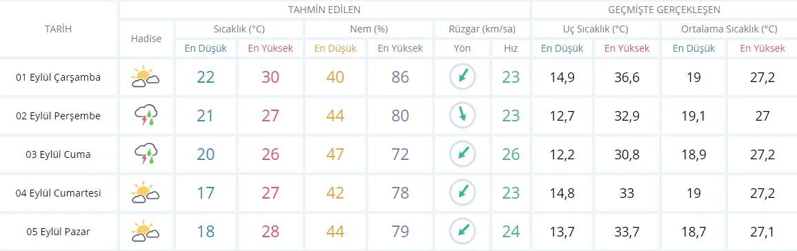 1 Eylül Çarşamba: 30 - nem oranı yüzde 86