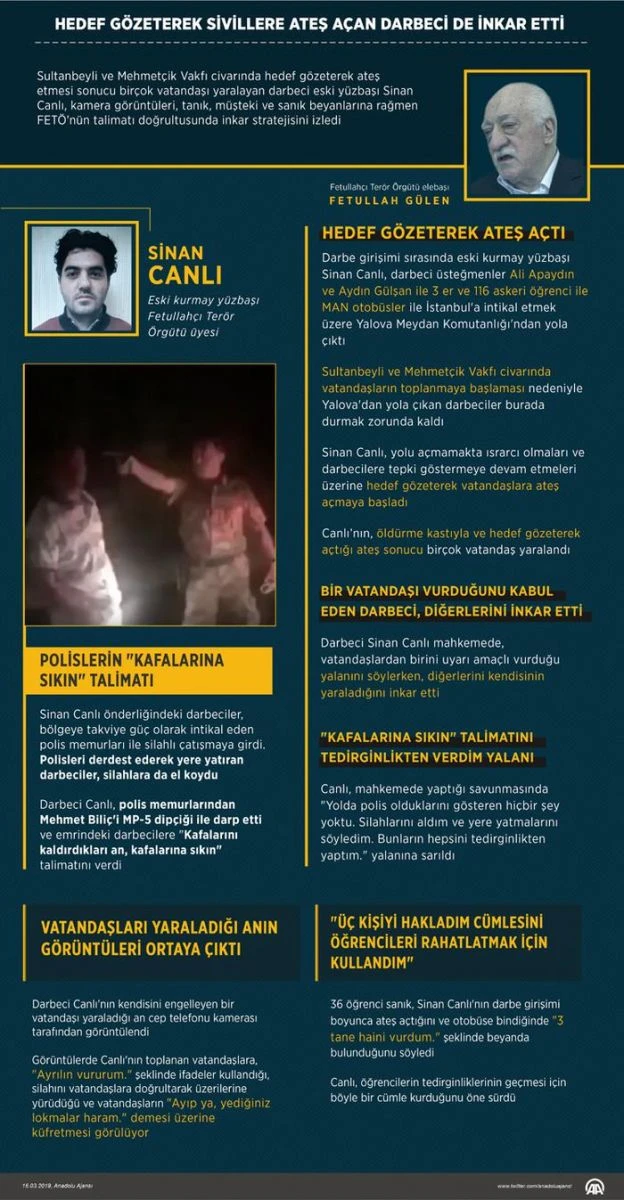 Sultanbeyli ve Mehmetçik Vakfı civarında hedef gözeterek ateş etmesi sonucu birçok vatandaşı yaralayan darbeci eski yüzbaşı Sinan Canlı, kamera görüntüleri, tanık, müşteki ve sanık beyanlarına rağmen FETÖ'nün talimatı doğrultusunda inkar stratejisini izledi.