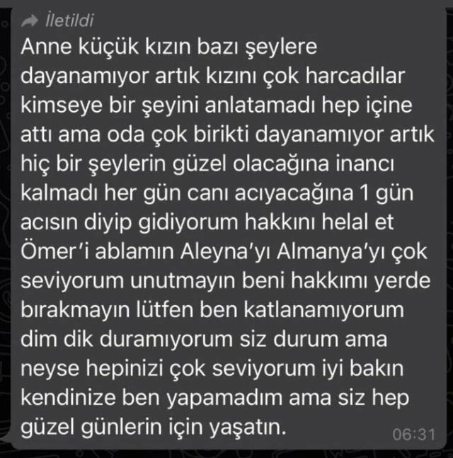Eda Nur'un intihardan önce annesine cep telefonuyla mesaj attığı ortaya çıktı. Eda Nur mesajında, "Anne küçük kızın bazı şeylere dayanamıyor artık. Kızını çok harcadılar. Kimseye bir şeyini anlatamadı. Hep içine attı. Ama o da çok birikti. Dayanamıyor artık. Hiçbir şeylerin güzel olacağına inancı kalmadı. Her gün canı acıyacağına bir gün acısın deyip gidiyorum. Hakkını helal et. Ömer'i, ablamı, Aleyna'yı Almanya'yı çok seviyorum. Unutmayın beni. Hakkımı yerde bırakmayın lütfen. Ben katlanamıyorum, dimdik duramıyorum siz durun. Neyse hepinizi çok seviyorum, iyi bakın kendinize. Ben yapamadım ama siz güzel günler için yaşayın" ifadesini kullandı.