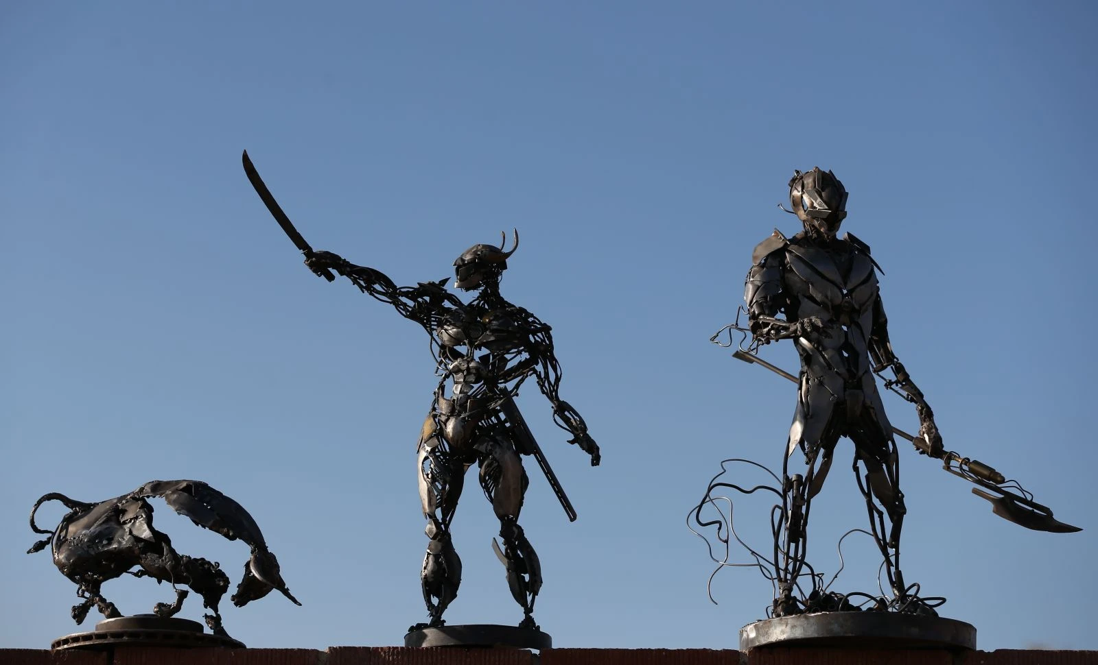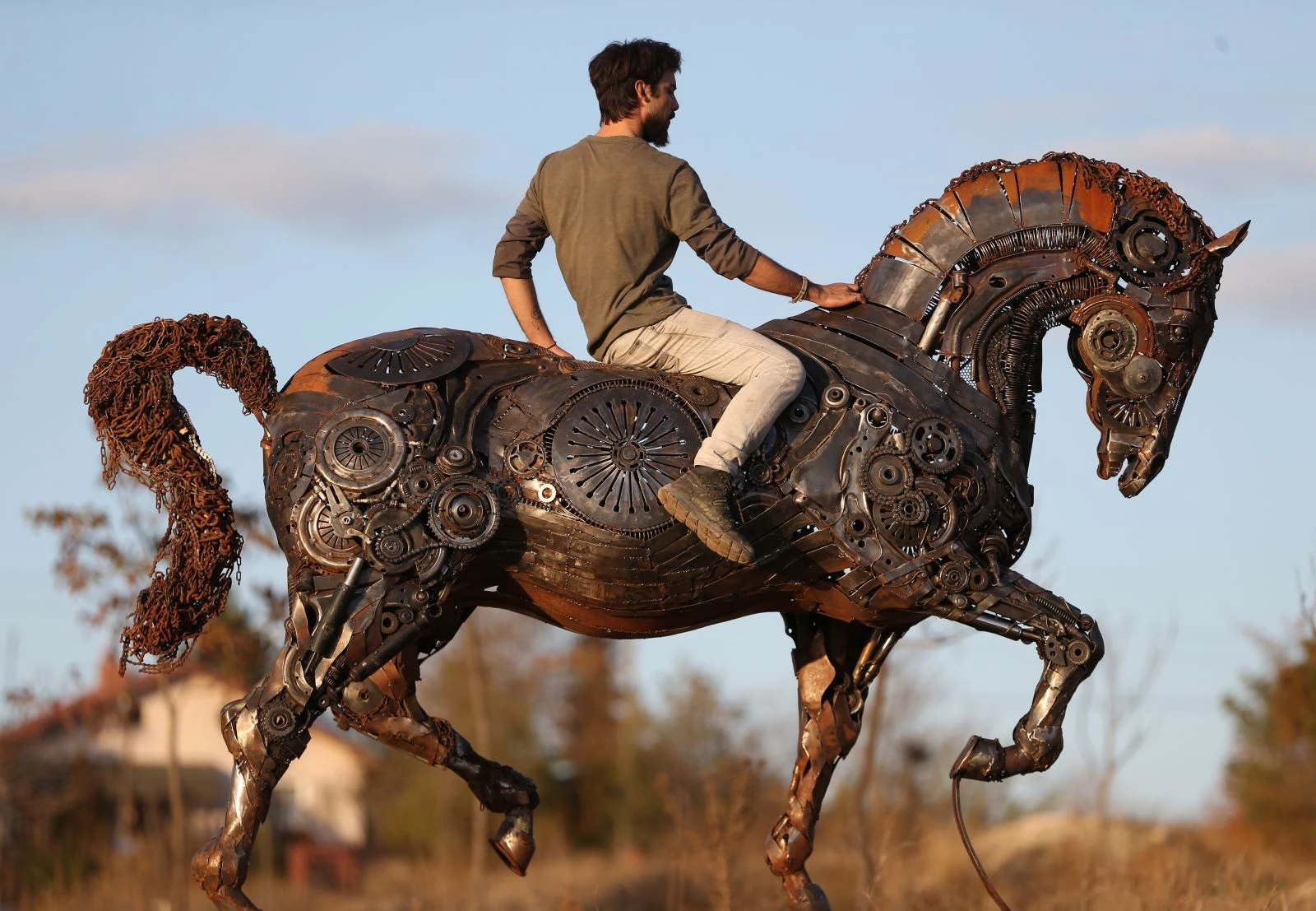 Yaklaşık 7 bin hurda parçadan bir yıllık çalışmayla bir ton ağırlığında metal at heykeli yapan Özkan'ın, boğanın yanı sıra astronot, el, savaşçı, gemi gibi birbirinden farklı, görkemli metal heykelleri de bulunuyor.