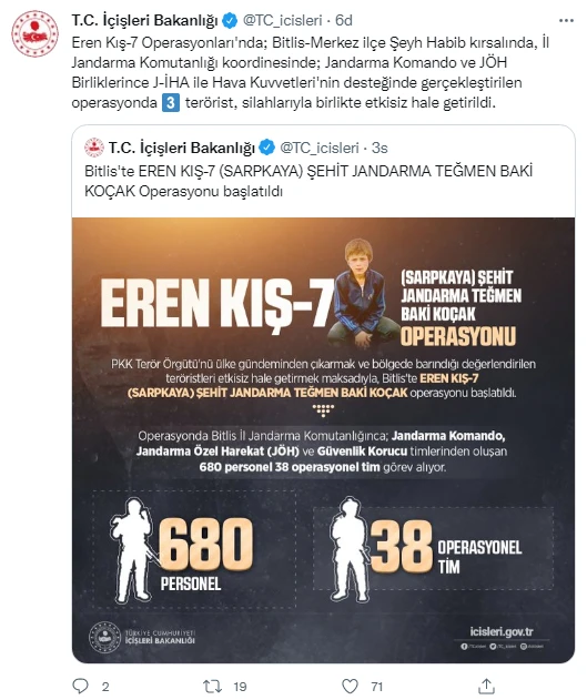 Bakanlıktan yapılan açıklamada "Bugün başlayan Eren Kış-7 Operasyonları kapsamında; Bitlis-Merkez ilçe Şeyh Habib kırsalında, İl Jandarma Komutanlığı koordinesinde; Jandarma Komando ve JÖH birliklerince J-İHA ile Hava Kuvvetleri'nin desteğinde icra edilen operasyonda 3 bölücü örgüt mensubu silahlarıyla birlikte etkisiz hale getirilmiştir. Bölgede operasyonlara devam edilmektedir" denildi.