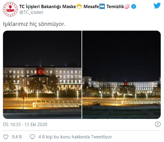 İçişleri Bakanlığı’ndan "ışıklarımız hiç sönmüyor" şeklinde bir paylaşımda bulunuldu.