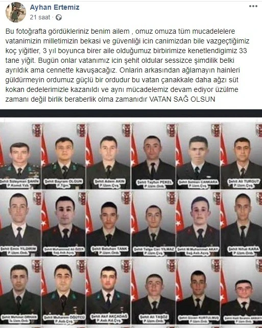 Ertemiz, “Bu fotoğrafta gördükleriniz benim ailem, omuz omuza tüm mücadelelere vatanımızın milletimizin bekası ve güvenliği için canımızdan bile vazgeçtiğimiz koç yiğitler, 3 yıl boyunca birer aile olduğumuz birbirimize kenetlendiğimiz 33 tane yiğit. Bugün onlar vatanımız için şehit oldular sessizce şimdilik belki ayrıldık ama cennette kavuşacağız. Onların arkasından ağlamayın hainleri güldürmeyin ordumuz güçlü bir ordudur bu vatan Çanakkale daha ağzı süt kokan dedelerimizle kazanıldı ve aynı mücadelemiz devam ediyor üzülme zamanı değil birlik beraberlik olma zamanıdır vatan sağ olsun” ifadelerine yer verdi.