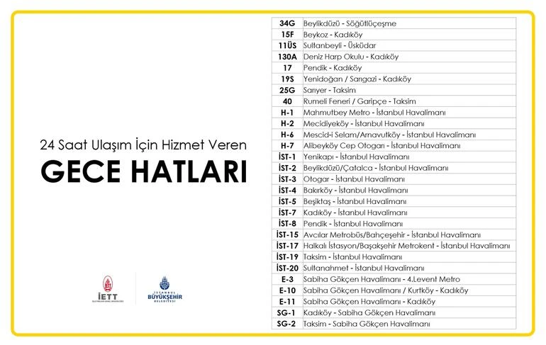 İşte İETT'nin paylaştığı 24 saat ulaşım için hizmet veren gece hatlarının listesi: